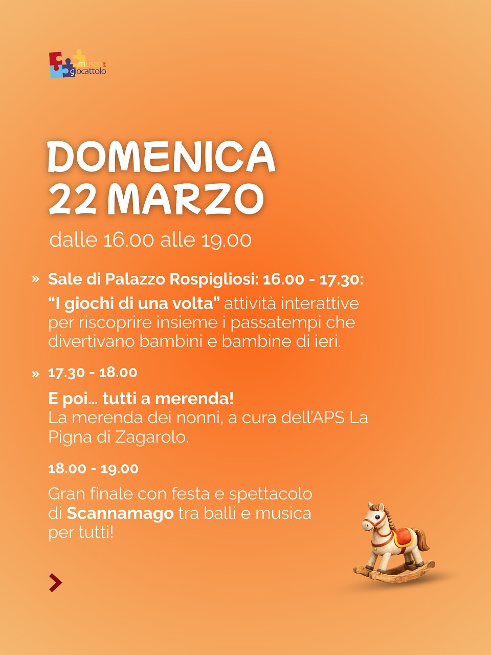 A seguire, la merenda dei nonni, a cura dell’APS La Pigna, e il gran finale con lo spettacolo di Scannamago, tra musica, festa e momenti di intrattenimento per tutti.