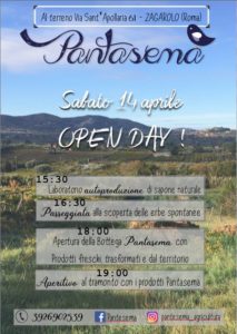 L’Associazione Pantasema vi aspetta il 14 aprile per il suo primo Open Day, durante il quale verranno presentate le novità di quest’anno. Sarà un pomeriggio aperto a tutti e pieno di appuntamenti. Alle 15:30 inizierà il laboratorio di autoproduzione del sapone naturale, alle 16:30 si potrà passeggiare alla scoperta delle erbe spontanee, a partire dalle 18:00 verrà aperta la Bottega Pantasema, nella quale potrete acquistare squisiti prodotti freschi e trasformati e alle 19:00 ci sarà l’aperitivo al tramonto con i prodotti dell’associazione.